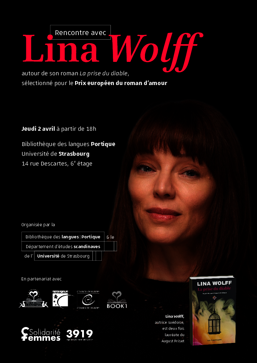 Autour de La Prise du Diable, roman de Lina Wolff, venez échanger avec l'autrice suédoise en personne, écouter des extraits en suédois et en français lus par des étudiant-es et découvrir grâce à l'aimable présence de l'Amicale du Conseil de l'Europe pourquoi un livre sur l'emprise amoureuse peut être discuté, nommé et mis en valeur dans le Prix Européen du Roman d'amour.